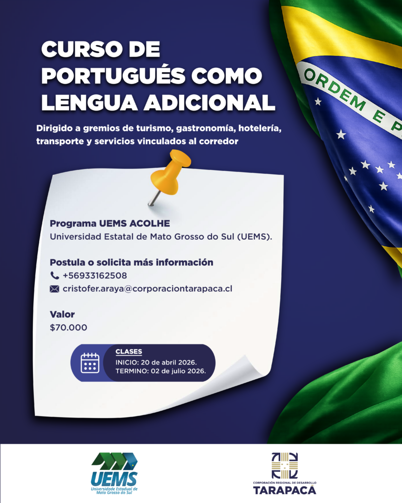 La Universidade Estadual de Mato Grosso do Sul (UEMS), en conjunto con la Corporación Regional de Desarrollo Tarapacá (CRDT), invitan a la comunidad regional a postular al Curso de Portugués como Lengua Adicional, una iniciativa orientada al aprendizaje del idioma oficial de Brasil, especialmente dirigida a quienes se desempeñan en los sectores de turismo, gastronomía, hotelería, transporte y servicios.